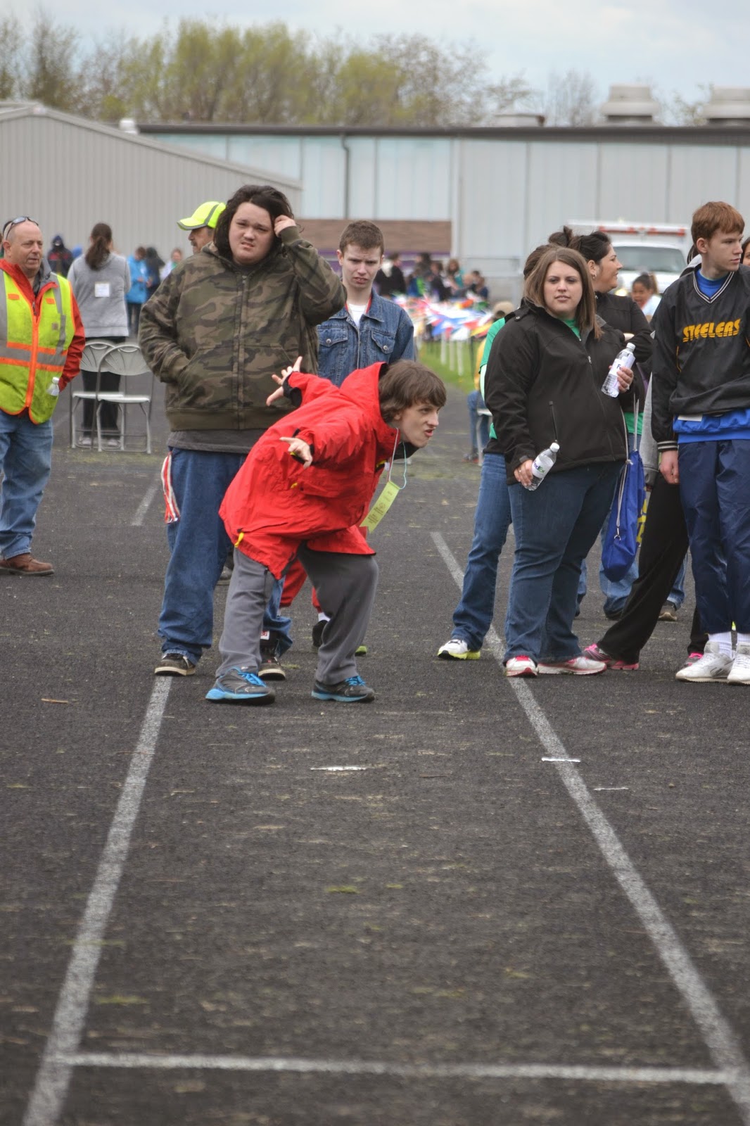 Last year, after 12 years of the Same Thing Every Year, there was a change in Dave's events, the substitution of hurling the Huge Iron Sphere of Death (or at least possible ouchie) from The Soft Ball Toss. This upset my applecart a bit. Hey, I've got to stand in front of this guy to take pictures. This year they changed the rest. Taking out the 50 meter run and Standing Long Jump and replacing them with the 100 meter run and Running Long Jump. I was a bit worried about them upsetting Dude's autistic mojo, but he'd had several weeks to get used to the idea. I was the only one distressed about it, but, since I wasn't the one actually competing, we just trucked our butts over to the Shot Put area to get ready.